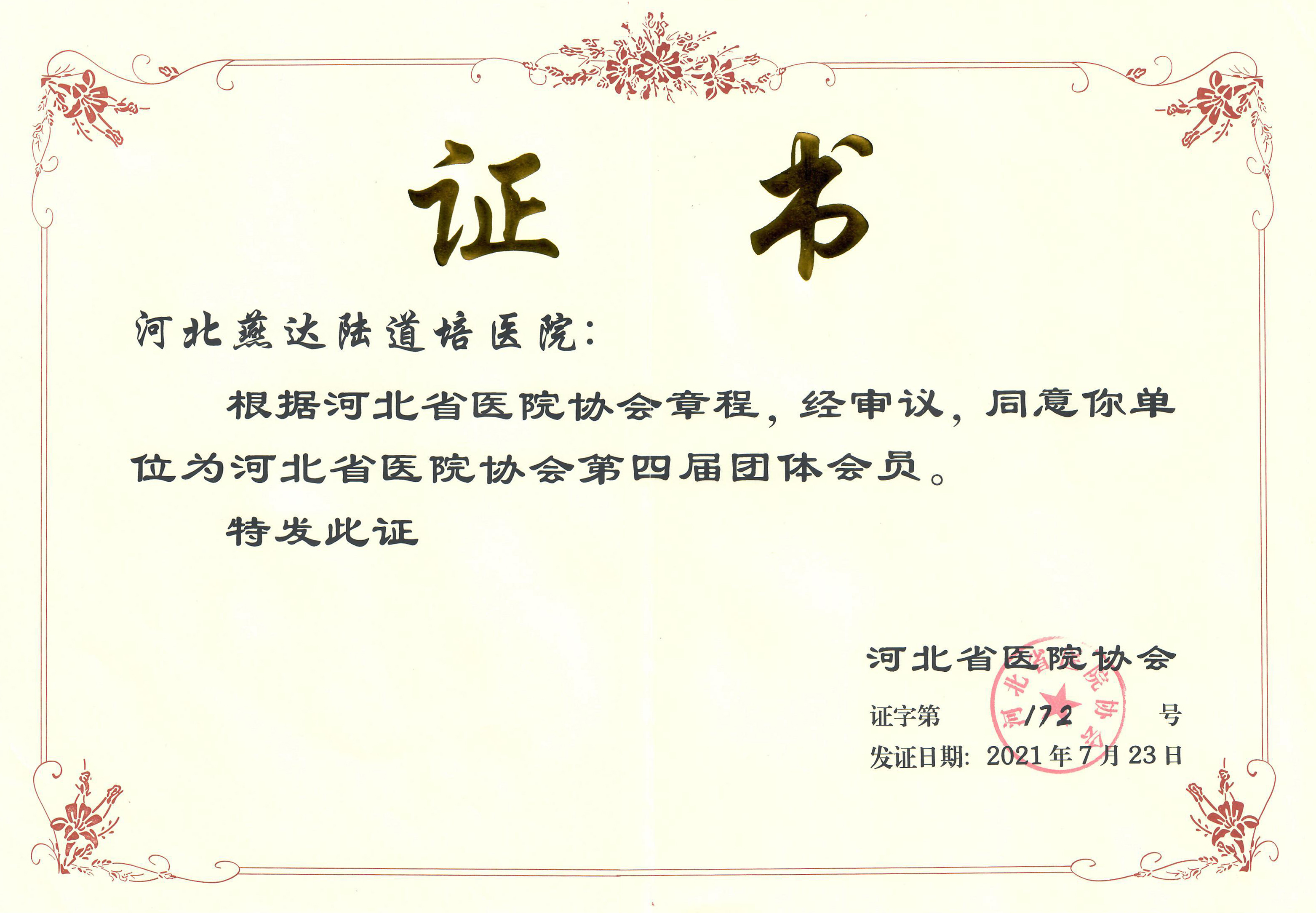 根據(jù)河北省醫(yī)院協(xié)會(huì)章程,經(jīng)審議,同意我單位為河北省醫(yī)院協(xié)會(huì)第四屆團(tuán)體會(huì)員。