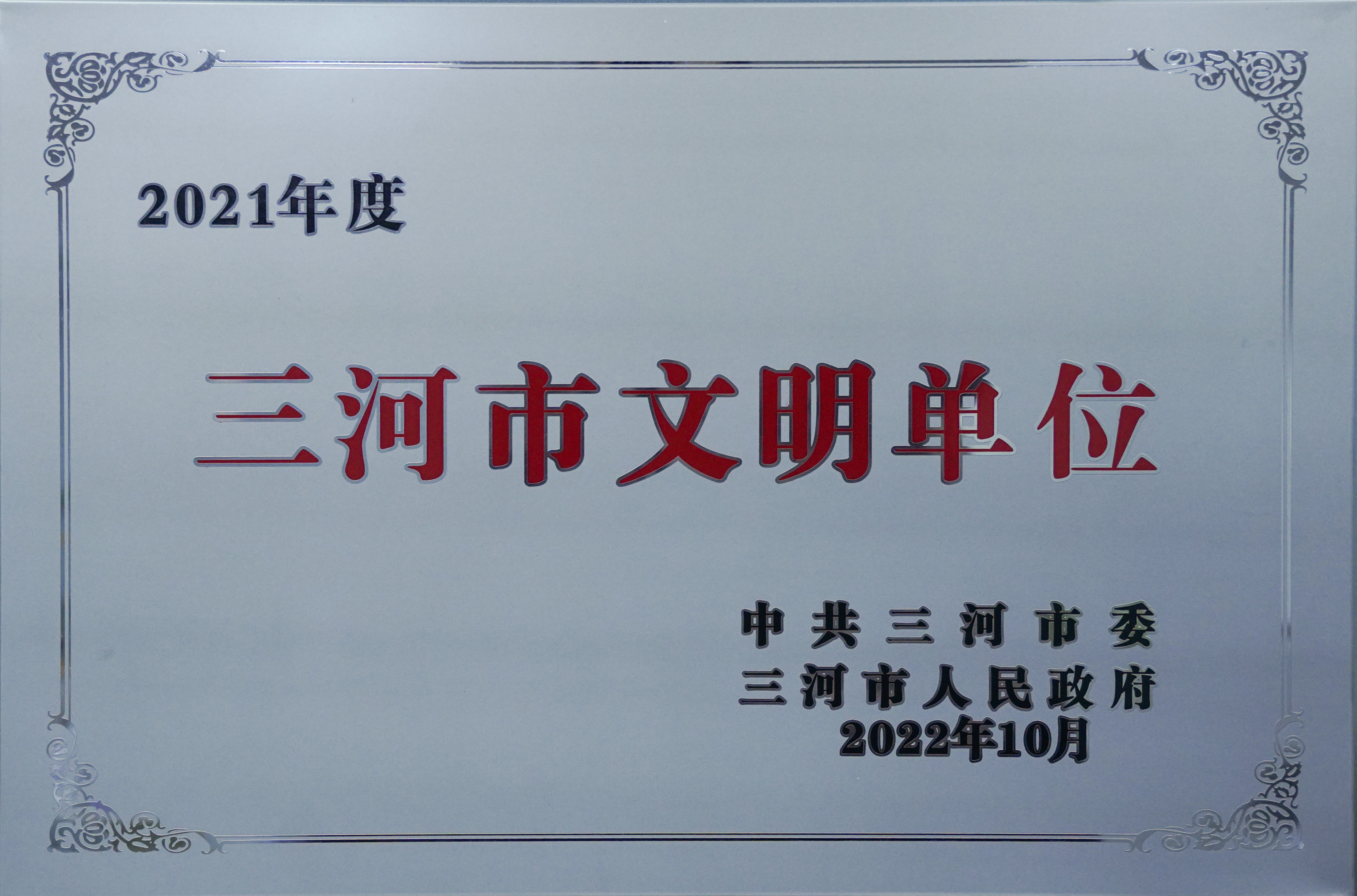 由中共三河市委三河市人民政府為河北燕達(dá)陸道培醫(yī)院頒發(fā)“三河市文明單位”。