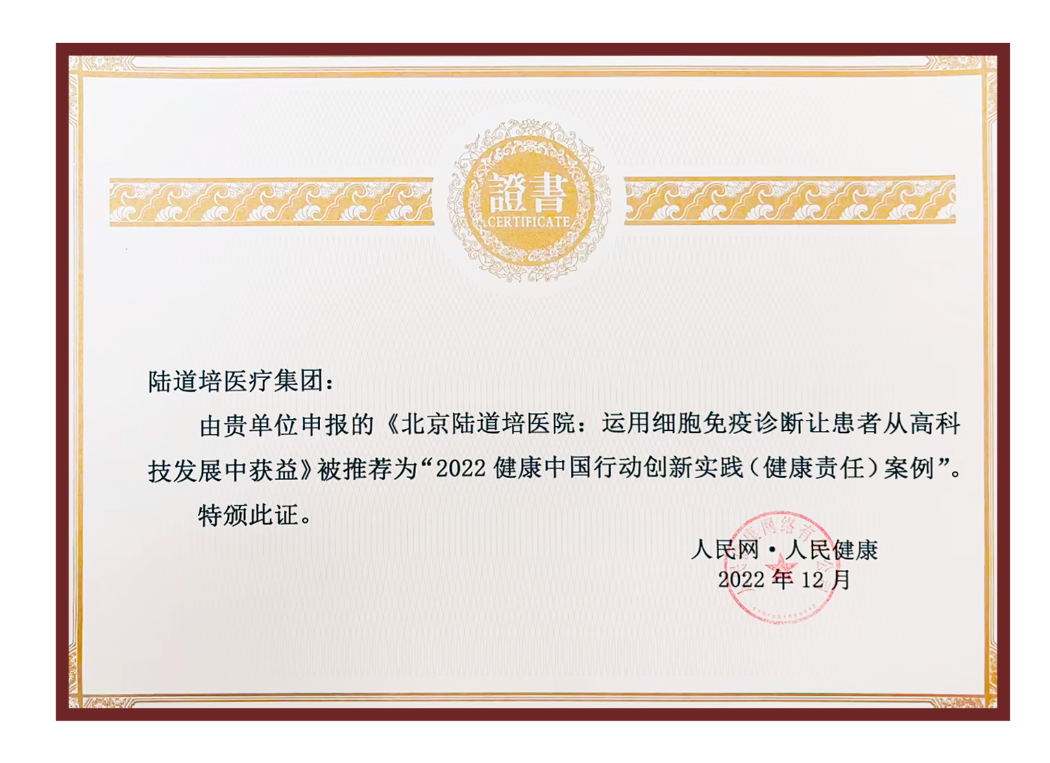 陸道培醫(yī)療集團(tuán)申報(bào)的《北京陸道培醫(yī)院:運(yùn)用細(xì)胞免疫診斷讓患者從高科技發(fā)展中獲益》,入選“2022健康中國(guó)行動(dòng)創(chuàng)新實(shí)踐(健康責(zé)任)案例”。