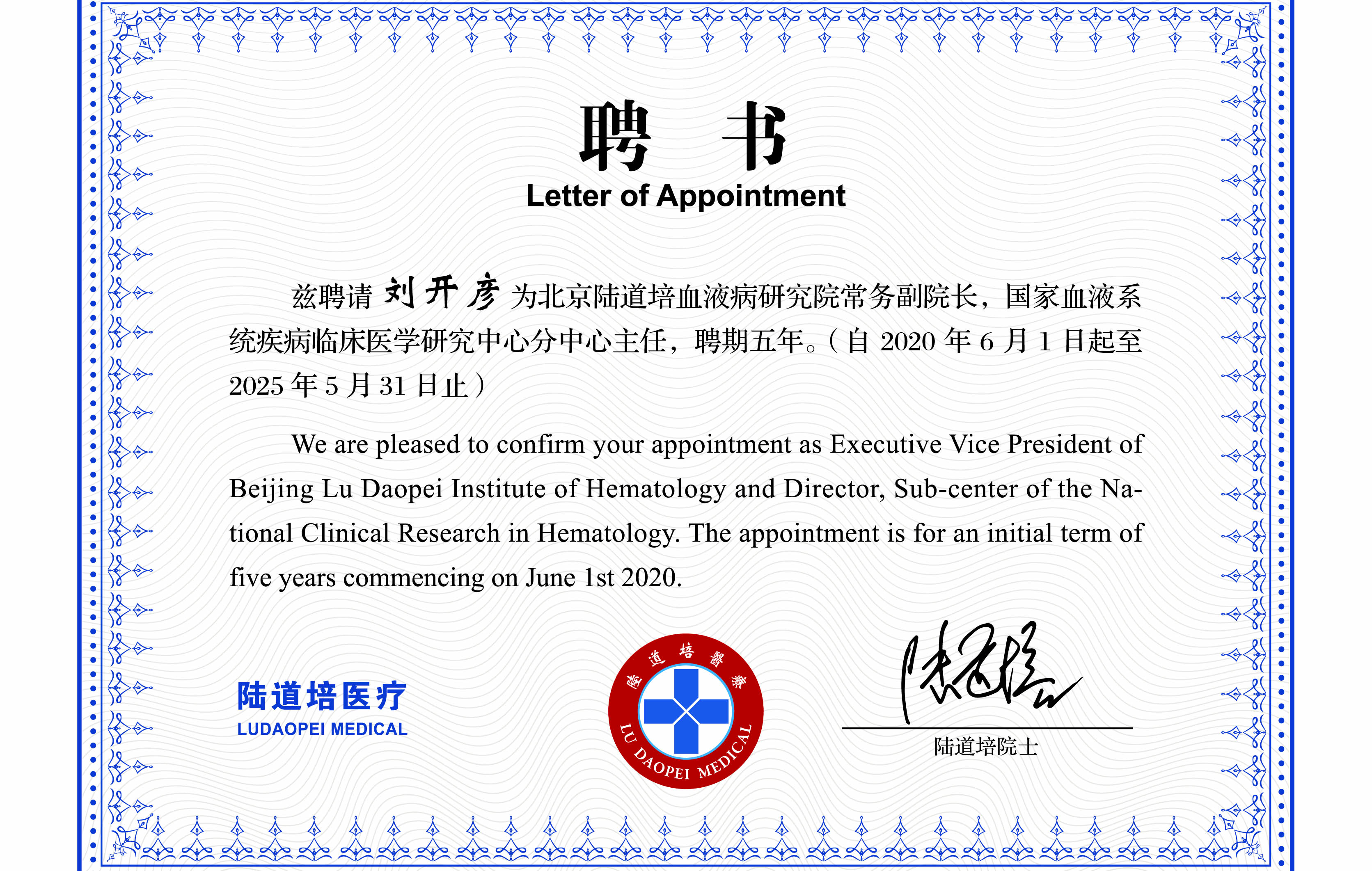 任命公告:特聘劉開彥教授為北京陸...